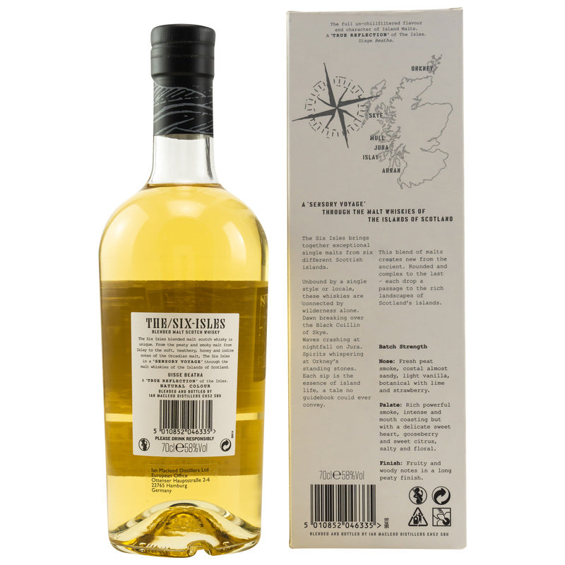 Diese Whiskys sind nicht durch einen einzigen Stil oder Ort gebunden, sondern vereinen den wilden Charakter der schottischen Inseln. The Six Isles versammelt Single Malts der Inseln Orkney und Islay, Skye und Arran sowie Mull und Jura. Der etablierte unabhängige Abfüller Ian Macleod hat mit den Blended Malt Scotch Whiskys echte Unikate geschaffen. Kein anderer Blend vereint die Essenz der Eilande in sich.Wer es intensiver mag, greift zum The Six Isles Batch Strength. Bei 58 Volumenprozenten entfaltet er in der Nase Torfrauch, maritime Noten, Limette und Erdbeere, füllt den Mund mit kräftigem Rauch, süßen Früchte und salzigen Tönen und klingt lange sowie torfig-fruchtig aus.